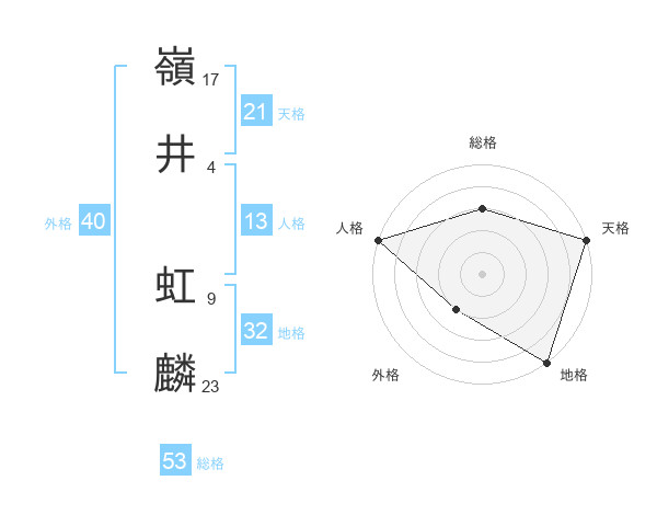 嶺井 虹麟さんの天格は21画の5点!