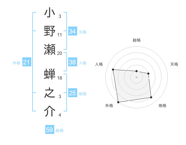小野瀬 蝉之介さんの外格は21画の5点!