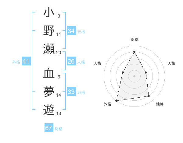 小野瀬 血夢遊さんを姓名の画数から五運を鑑定