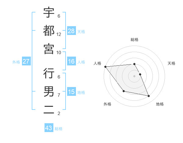 宇都宮 行男二さんを姓名の画数から五運を鑑定