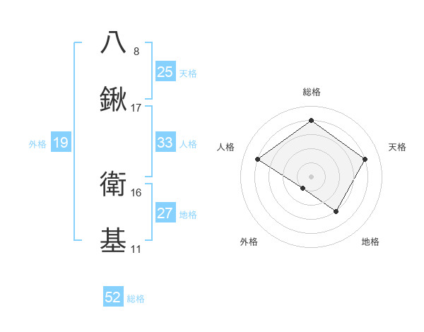 八鍬 衛基さんの総格は52画の4点!