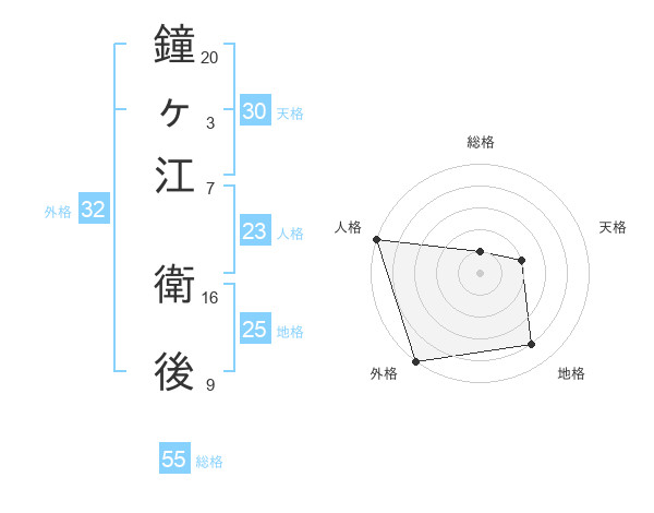 鐘ヶ江 衛後さんの外格は32画の5点!
