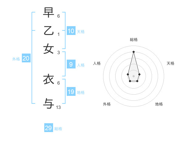早乙女 衣与さんの総格は29画の4点