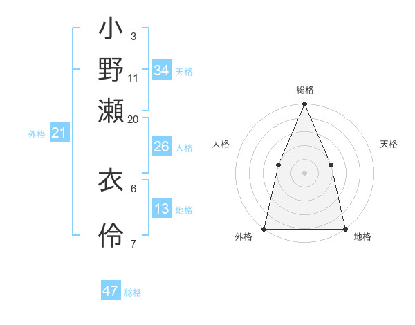 小野瀬 衣伶さんの総格は47画の5点!