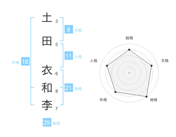 土田 衣和李さんの総格は29画の4点