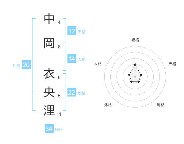 中岡 衣央浬さんの総格は34画の2点!