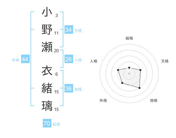小野瀬 衣緒璃さんの総格は70画の1点!