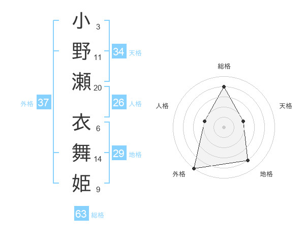 小野瀬 衣舞姫さんの総格は63画の4点!