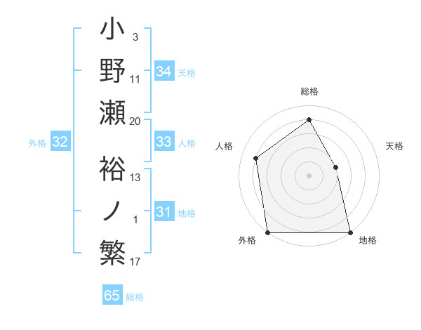 小野瀬 裕ノ繁さんの総格は65画の4点