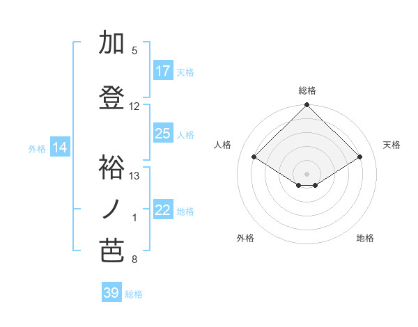 加登 裕ノ芭さんを姓名の画数から五運を鑑定