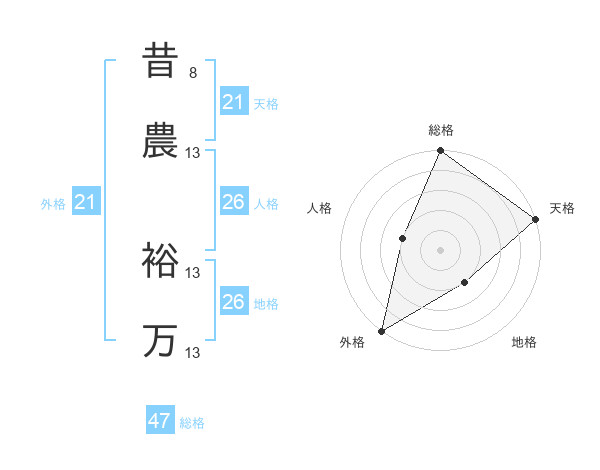 昔農 裕万さんを姓名の画数から五運を鑑定