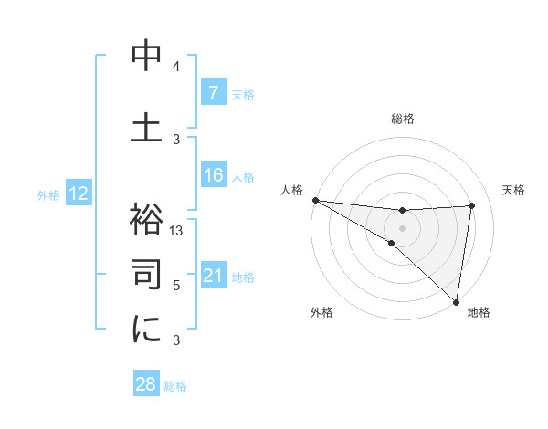 中土 裕司にさんの総格は28画の1点!