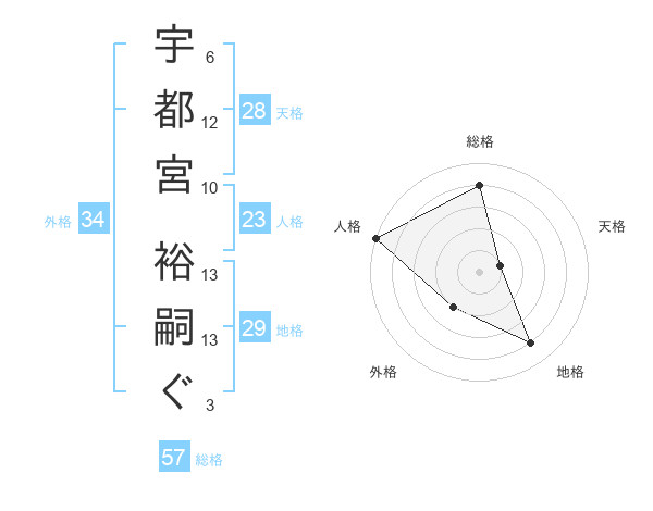 宇都宮 裕嗣ぐさんの総格は57画の4点!