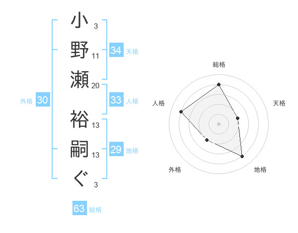 小野瀬 裕嗣ぐさんの総格は63画の4点!