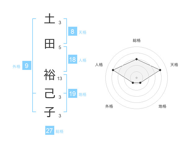 土田 裕己子さんを姓名の画数から五運を鑑定