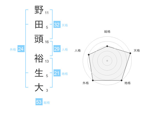 野田頭 裕生大さんを姓名の画数から五運を鑑定