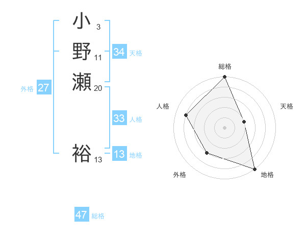 小野瀬 裕さんの総格は47画の5点!