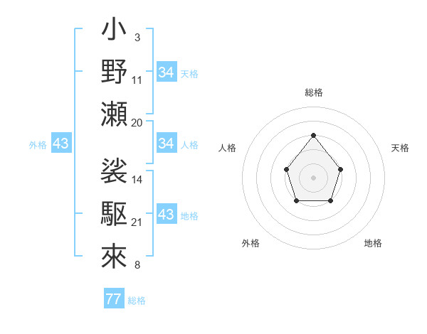 小野瀬 裟駆來さんの総格は77画の3点!