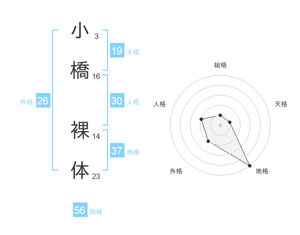 小橋 裸体さんを姓名の画数から五運を鑑定