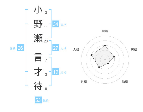 小野瀬 言才待さんを姓名の画数から五運を鑑定