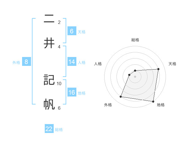 二井 記帆さんの地格は16画の5点!