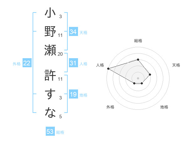 小野瀬 許すなさんを姓名の画数から五運を鑑定