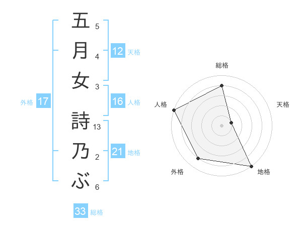 五月女 詩乃ぶさんを姓名の画数から五運を鑑定