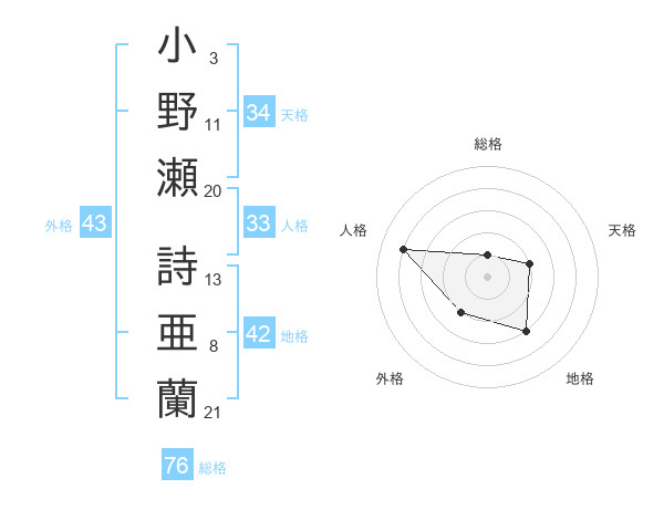 小野瀬 詩亜蘭さんの総格は76画の1点!