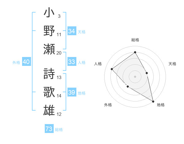 小野瀬 詩歌雄さんの総格は73画の4点!