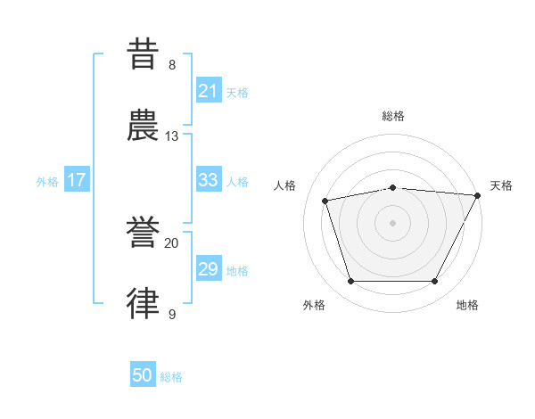 昔農 誉律さんを姓名の画数から五運を鑑定