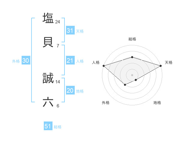 塩貝 誠六さんの総格は51画の3点!