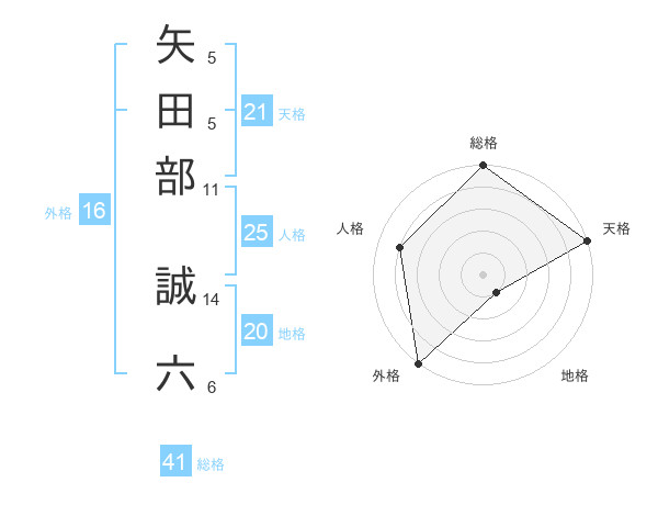 矢田部 誠六さんの外格は16画の5点!