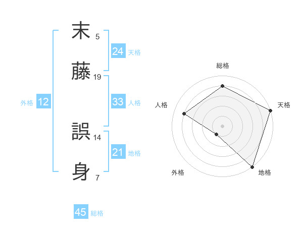 末藤 誤身さんの総格は45画の4点!