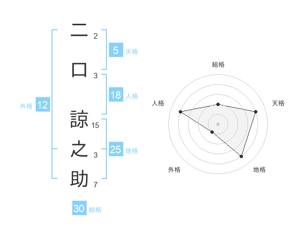 二口 諒之助さんを姓名の画数から五運を鑑定