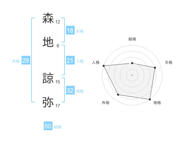 森地 諒弥さんの総格は50画の2点!