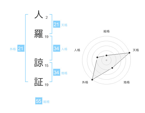 人羅 諒証さんの総格は55画の1点!