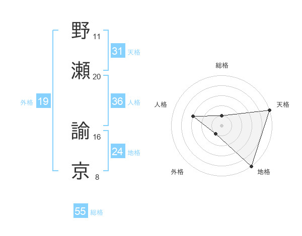 野瀬 諭京さんの総格は55画の1点!