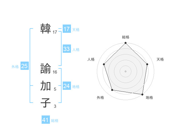 韓 諭加子さんを姓名の画数から五運を鑑定