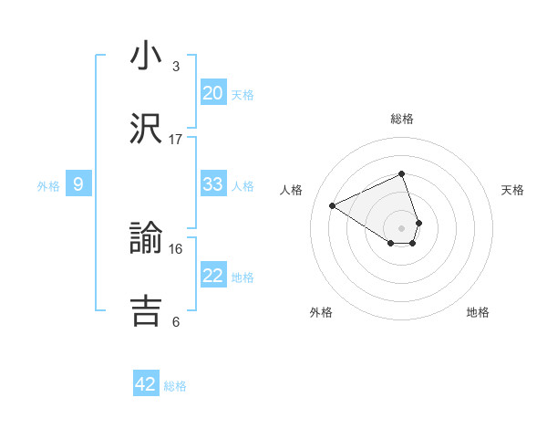 小沢 諭吉さんの地格は22画の1点!