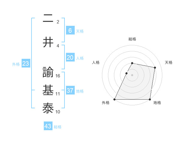 二井 諭基泰さんの総格は43画の2点!