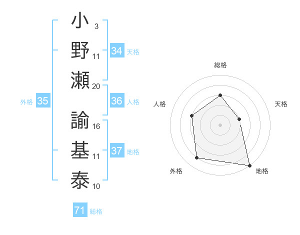 小野瀬 諭基泰さんの総格は71画の3点