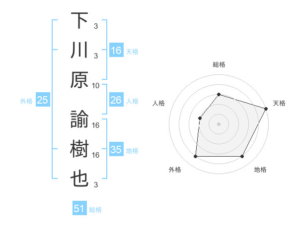 下川原 諭樹也さんの総格は51画の3点!