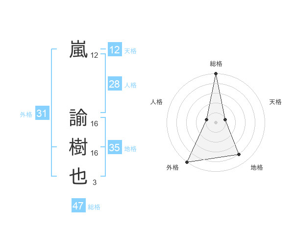嵐 諭樹也さんの総格は47画の5点!