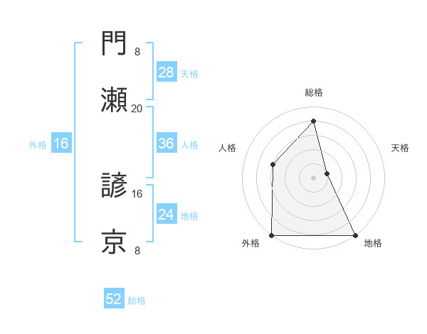 門瀬 諺京さんの総格は52画の4点!
