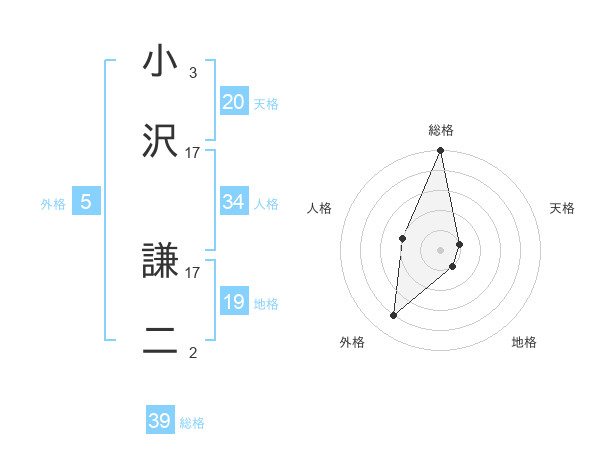 小沢 謙二さんの総格は39画の5点!