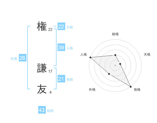 権 謙友さんの総格は43画の2点!