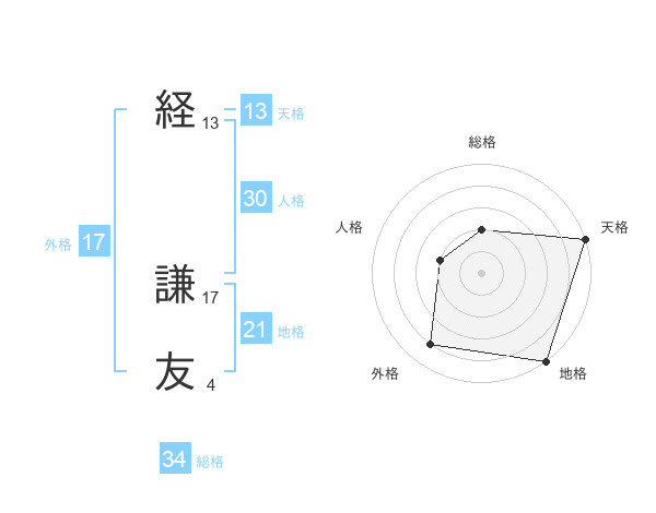 経 謙友さんの総格は34画の2点!