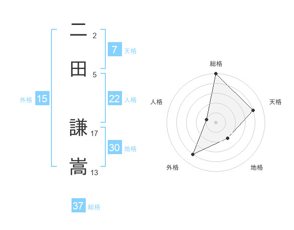 二田 謙嵩さんの総格は37画の5点!