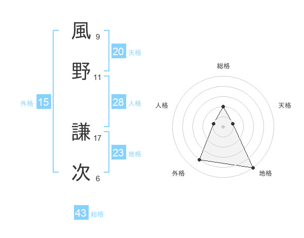 風野 謙次さんの総格は43画の2点!