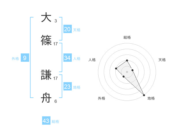 大篠 謙舟さんの総格は43画の2点!